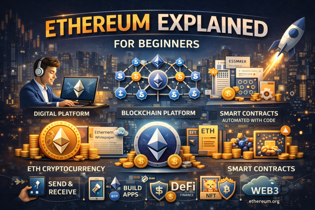 Ethereum Explained simply: Ethereum is a leading blockchain platform that allows people to send digital money (ETH) and build decentralized applications without banks or intermediaries.